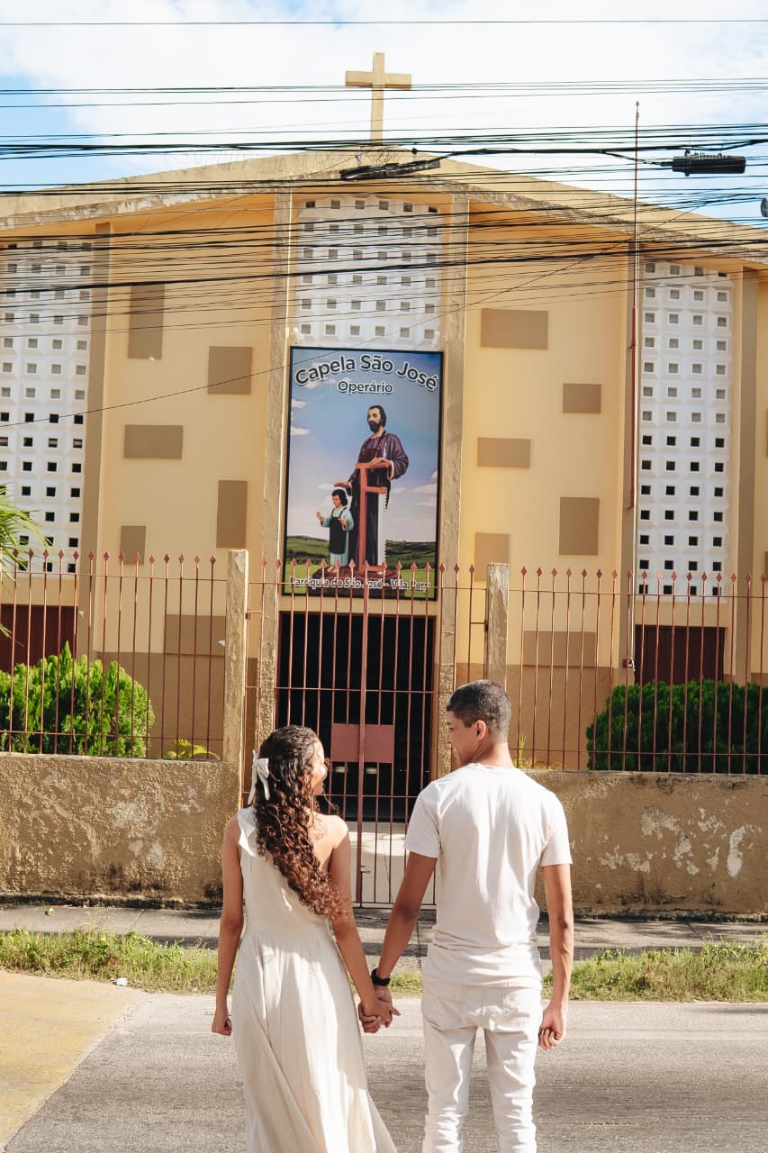Nossa história começou há muitos anos, em um lugar que se tornou ainda mais especial para nós: a capela São José Operário onde nos conhecemos. Quando tínhamos apenas 13 anos, éramos coroinhas ali, e foi naquele espaço cheio de histórias e memórias que começamos nossa caminhada juntos. Desde então, capela tem sido testemunha de cada etapa do nosso amor, desde os primeiros olhares tímidos, do namoro que floresceu ao longo dos anos, e do pedido de casamento que selou nosso compromisso.